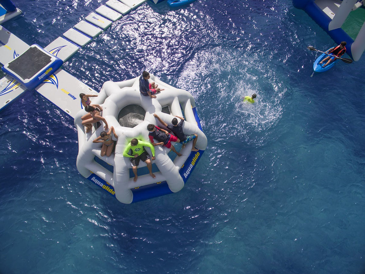 Climb, hang, splash and slide on the Aquaglide Thunderdome! The Thunderdome is a climbing mountain, an 8 sided slide with a a 9 position mesh crows nest, and a mesh paneled, splash zone floor. With a capacity for up to 12 users Thunderdome will provide hours of fun for your campers or guests. The Aquaglide Thunderdome can be used as a standalone climber using a Swimstep boarding platform or connect it to other Aquaglide products with a Speedway to build a water playground!