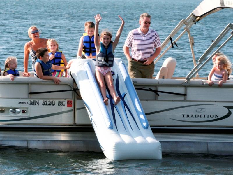 Entertain all ages with this rugged, commercial grade, inflatable Pontoon Boat slide. Place the pontoon slide over the side gate of your pontoon boat, inflate the slide, secure it to the exterior rail with the four attached straps and watch the kids or join in on the fun. Once you’ve finished the fun, simply deflate and the slide rolls up to the size of a sleeping bag for easy storage under a seat or in a cooler!