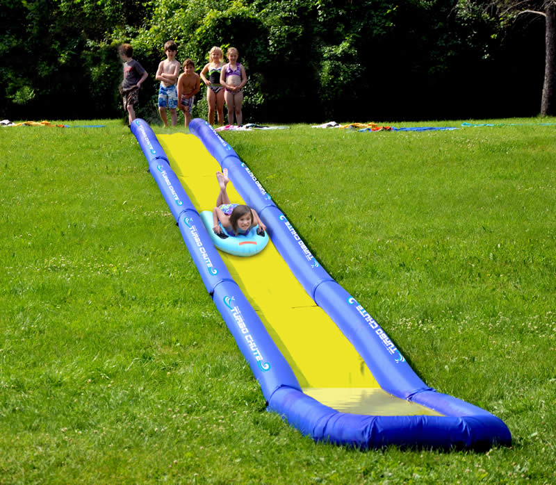 The Rave Turbo Chute Backyard Package includes everything you need to create a thrilling 56′ long water slide slip and slide at your home, cottage, camp or resort! The 20′ modular sections make it easy for you to make the slip and slide as long as you need it, and are compact and lightweight for easy set-up, take down and storage! The 6′ Starter Mat provides padding at the start of your Turbo Chute water slide for extra rider safety. Chute down the slide and end the ride with a splash on the Turbo Sled!